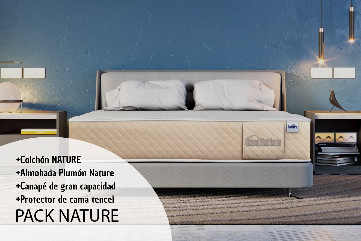 ¡Despierta renovado cada día con el Pack NATURE! Disfruta de cada noche de descanso con el colchón NATURE y la almohada plumón NATURE. Además, nuestro elegante Canapé abatible y protector de colchón Tencel garantizan una experiencia de descanso completa y protegida.